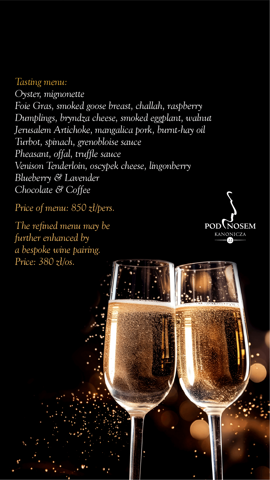 Join us for an unforgettable New Year’s Eve celebration featuring an exquisite seven-course tasting menu crafted by our chef, Przemysław Bilski. Indulge in a true feast of flavors and welcome the New Year in the elegant atmosphere of Pod Nosem.